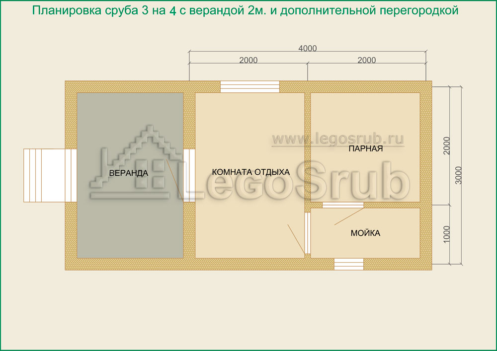 Вагонка на потолок толщина 20 (мм.) -500 (руб/м²) Дверь деревянная на иглицах с коробкой без фурнитуры и монтажа размер: 1750х750 -3800 (руб/шт.) Окно двойное без стекла, фурнитуры и монтажа размер: 500х500 -1500 (руб/шт.) (пиломатериалы и столярные изделия - естественной влажности.) Планировка:На стадии планировки сруба для бани обычно всех беспокоит множество вопросов. Делать ли парную и моечную отдельно, где и как расположить двери и окна, сколько комнат будет в срубе?..Не беспокойтесь!!! Наши специалисты всегда ответят на волнующие Вас вопросы, помогут принять оптимальное решение. Планировка будет происходить под Вашим руководством. Размещение внутренней перегородки, размер помещений, даже расположение будущих окон и дверей сможете выбрать Вы сами. А мы постараемся помочь Вам в этом нелегком выборе. Ниже представлены чертежи, наиболее популярных планировок для бань размера 3*4 с верандой.