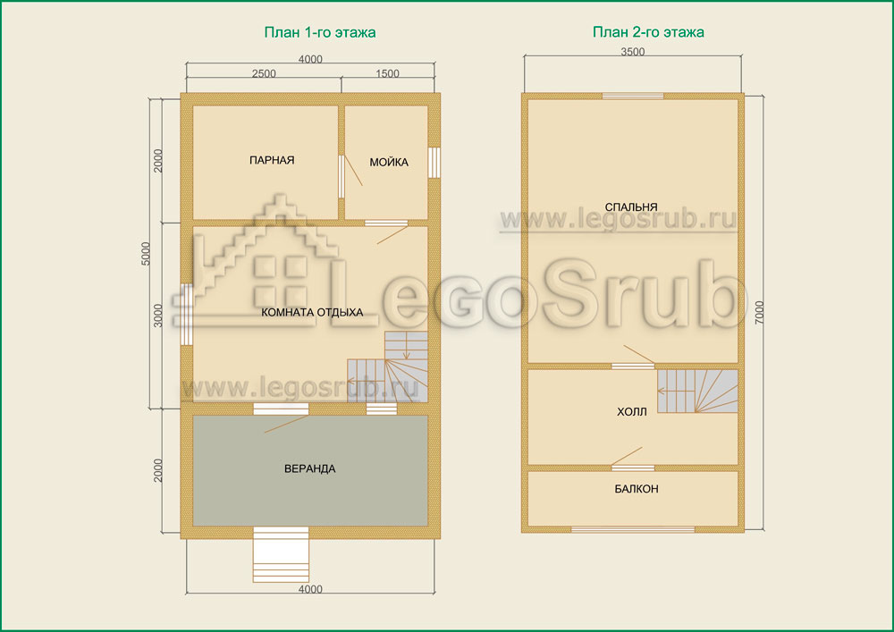 Вагонка на потолок толщина 20 (мм.) -500 (руб/м²) Дверь деревянная на иглицах с коробкой без фурнитуры и монтажа размер: 1750х750 -3800 (руб/шт.) Окно двойное без стекла, фурнитуры и монтажа размер: 500х500 -1500 (руб/шт.) (пиломатериалы и столярные изделия - естественной влажности.) Планировка:На стадии планировки сруба для бани обычно всех беспокоит множество вопросов. Делать ли парную и моечную отдельно, где и как расположить двери и окна, сколько комнат будет в срубе?..Не беспокойтесь!!! Наши специалисты всегда ответят на волнующие Вас вопросы, помогут принять оптимальное решение. Планировка будет происходить под Вашим руководством. Размещение внутренней перегородки, размер помещений, даже расположение будущих окон и дверей сможете выбрать Вы сами. А мы постараемся помочь Вам в этом нелегком выборе. Ниже представлены чертежи, наиболее популярных планировок для бань размера 4*5 с верандой и мансардой.