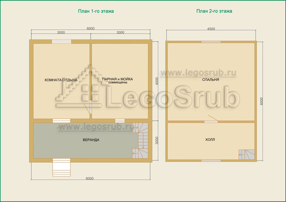 Вагонка на потолок толщина 20 (мм.) -500 (руб/м²) Дверь деревянная на иглицах с коробкой без фурнитуры и монтажа размер: 1750х750 -3800 (руб/шт.) Окно двойное без стекла, фурнитуры и монтажа размер: 500х500 -1500 (руб/шт.) (пиломатериалы и столярные изделия - естественной влажности.) Планировка:На стадии планировки сруба для бани обычно всех беспокоит множество вопросов. Делать ли парную и моечную отдельно, где и как расположить двери и окна, сколько комнат будет в срубе?..Не беспокойтесь!!! Наши специалисты всегда ответят на волнующие Вас вопросы, помогут принять оптимальное решение. Планировка будет происходить под Вашим руководством. Размещение внутренней перегородки, размер помещений, даже расположение будущих окон и дверей сможете выбрать Вы сами. А мы постараемся помочь Вам в этом нелегком выборе. Ниже представлены чертежи, наиболее популярных планировок для бань размера 4*6 с верандой и мансардой.
