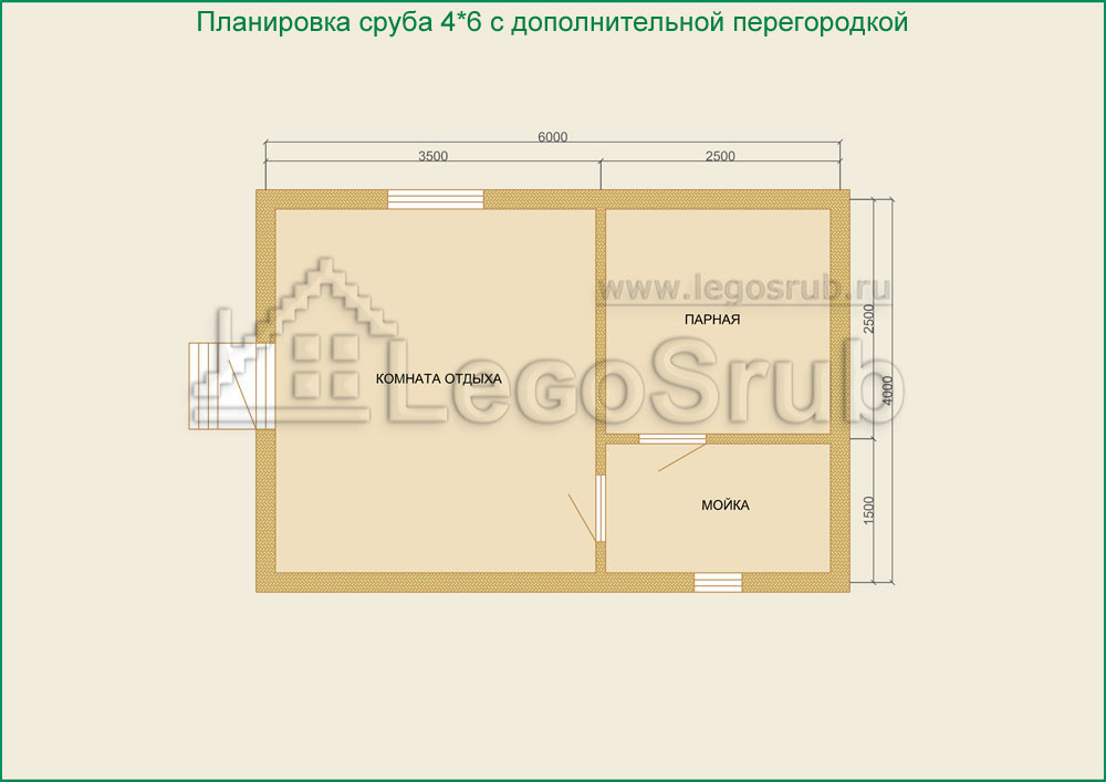Вагонка на потолок толщина 20 (мм.) -500 (руб/м²) Дверь деревянная на иглицах с коробкой без фурнитуры и монтажа размер: 1750х750 -3800 (руб/шт.) Окно двойное без стекла, фурнитуры и монтажа размер: 500х500 -1500 (руб/шт.) (пиломатериалы и столярные изделия - естественной влажности.) Планировка:На стадии планировки сруба для бани обычно всех беспокоит множество вопросов. Делать ли парную и моечную отдельно, где и как расположить двери и окна, сколько комнат будет в срубе?..Не беспокойтесь!!! Наши специалисты всегда ответят на волнующие Вас вопросы, помогут принять оптимальное решение. Планировка будет происходить под Вашим руководством. Размещение внутренней перегородки, размер помещений, даже расположение будущих окон и дверей сможете выбрать Вы сами. А мы постараемся помочь Вам в этом нелегком выборе. Ниже представлены чертежи, наиболее популярных планировок для бань размера 4*6.