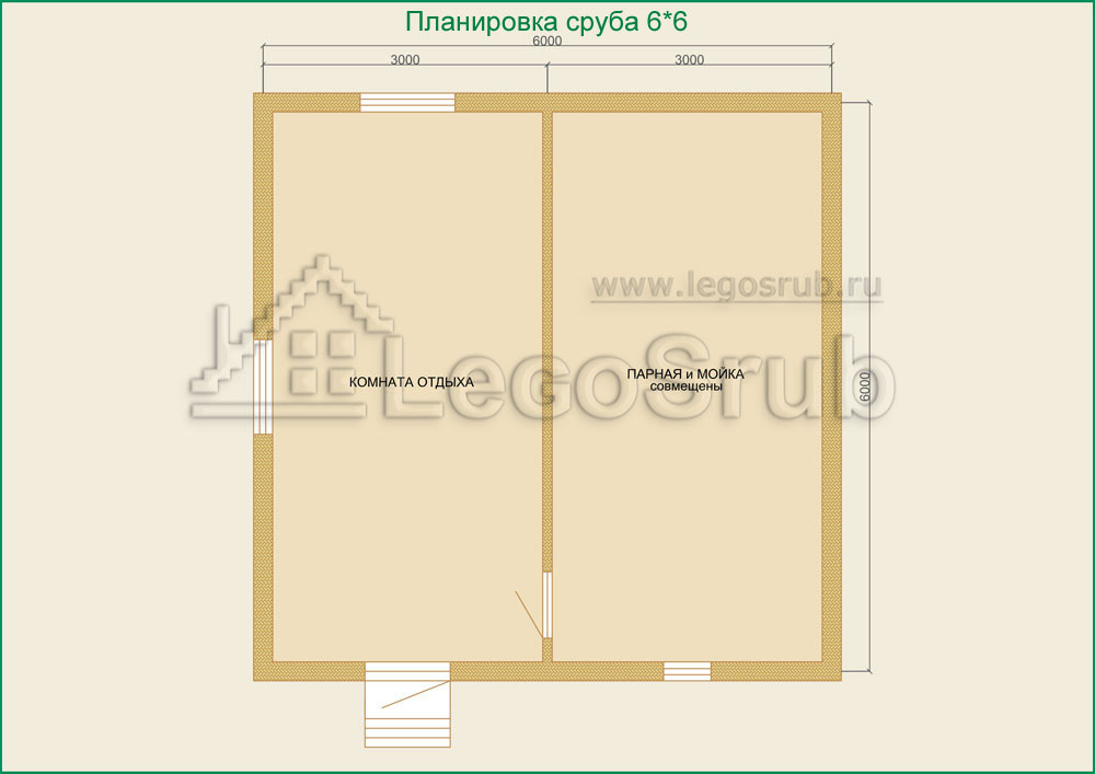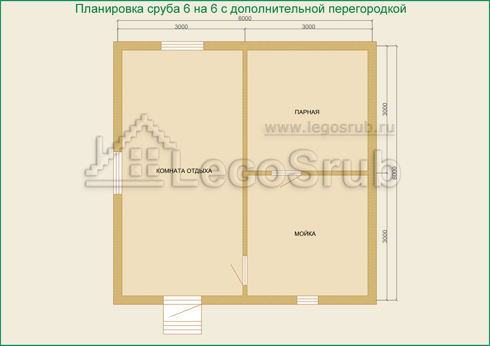 Вагонка на потолок толщина 20 (мм.) -500 (руб/м²) Дверь деревянная на иглицах с коробкой без фурнитуры и монтажа размер: 1750х750 -3800 (руб/шт.) Окно двойное без стекла, фурнитуры и монтажа размер: 500х500 -1500 (руб/шт.) (пиломатериалы и столярные изделия - естественной влажности.) Планировка:На стадии планировки сруба для бани обычно всех беспокоит множество вопросов. Делать ли парную и моечную отдельно, где и как расположить двери и окна, сколько комнат будет в срубе?..Не беспокойтесь!!! Наши специалисты всегда ответят на волнующие Вас вопросы, помогут принять оптимальное решение. Планировка будет происходить под Вашим руководством. Размещение внутренней перегородки, размер помещений, даже расположение будущих окон и дверей сможете выбрать Вы сами. А мы постараемся помочь Вам в этом нелегком выборе. Ниже представлены чертежи, наиболее популярных планировок для бань размера 6*6.