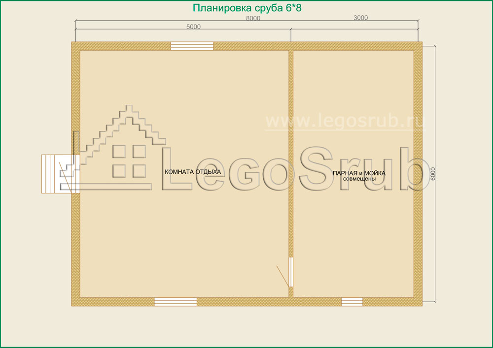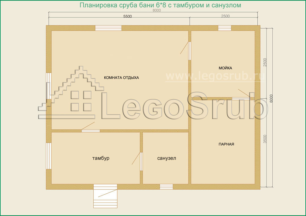 Вагонка на потолок толщина 20 (мм.) -500 (руб/м²) Дверь деревянная на иглицах с коробкой без фурнитуры и монтажа размер: 1750х750 -3800 (руб/шт.) Окно двойное без стекла, фурнитуры и монтажа размер: 500х500 -1500 (руб/шт.) (пиломатериалы и столярные изделия - естественной влажности.) Планировка:На стадии планировки сруба для бани обычно всех беспокоит множество вопросов. Делать ли парную и моечную отдельно, где и как расположить двери и окна, сколько комнат будет в срубе?..Не беспокойтесь!!! Наши специалисты всегда ответят на волнующие Вас вопросы, помогут принять оптимальное решение. Планировка будет происходить под Вашим руководством. Размещение внутренней перегородки, размер помещений, даже расположение будущих окон и дверей сможете выбрать Вы сами. А мы постараемся помочь Вам в этом нелегком выборе. Ниже представлены чертежи, наиболее популярных планировок для бань размера 6*6.