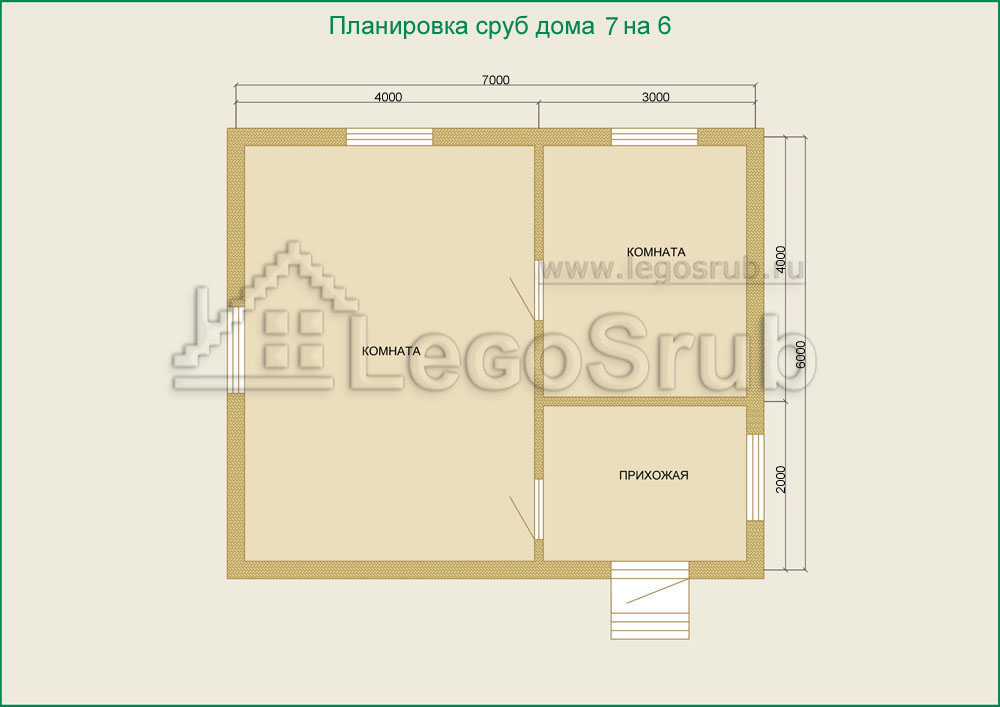 Вагонка на потолок толщина 20 (мм.) -500 (руб/м²) (пиломатериалы естественной влажности.) Планировка:На стадии планировки сруба для дома обычно всех беспокоит множество вопросов. Где и как расположить двери и окна, сколько комнат будет в срубе?..Не беспокойтесь!!! Наши специалисты всегда ответят на волнующие Вас вопросы, помогут принять оптимальное решение. Планировка будет происходить под Вашим руководством. Размещение внутренней перегородки, размер помещений, даже расположение будущих окон и дверей сможете выбрать Вы сами. А мы постараемся помочь Вам в этом нелегком выборе. Ниже представлены чертежи, наиболее популярных планировок для дачных домов из бревна, размера 6*7.
