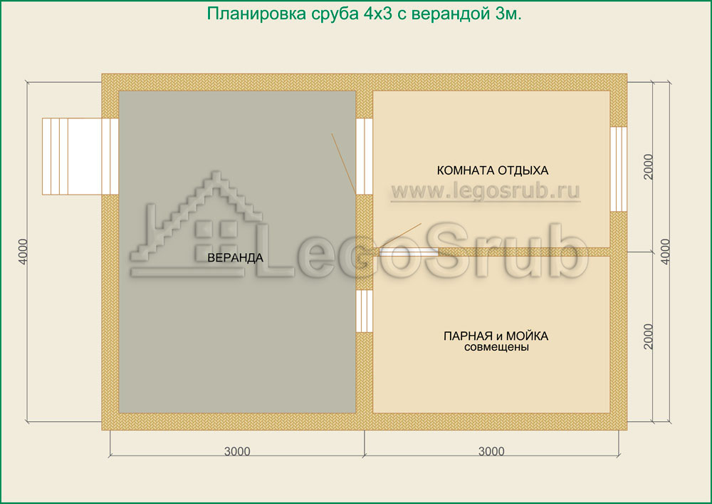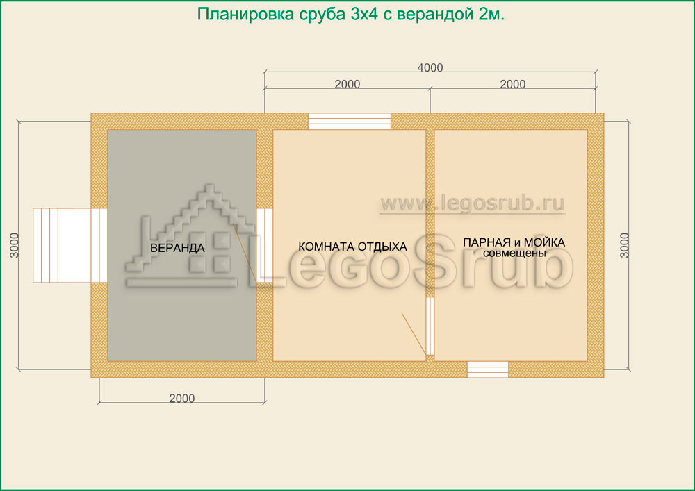 Вагонка на потолок толщина 20 (мм.) -500 (руб/м²) Дверь деревянная на иглицах с коробкой без фурнитуры и монтажа размер: 1750х750 -3800 (руб/шт.) Окно двойное без стекла, фурнитуры и монтажа размер: 500х500 -1500 (руб/шт.) (пиломатериалы и столярные изделия - естественной влажности.) Планировка:На стадии планировки сруба для бани обычно всех беспокоит множество вопросов. Делать ли парную и моечную отдельно, где и как расположить двери и окна, сколько комнат будет в срубе?..Не беспокойтесь!!! Наши специалисты всегда ответят на волнующие Вас вопросы, помогут принять оптимальное решение. Планировка будет происходить под Вашим руководством. Размещение внутренней перегородки, размер помещений, даже расположение будущих окон и дверей сможете выбрать Вы сами. А мы постараемся помочь Вам в этом нелегком выборе. Ниже представлены чертежи, наиболее популярных планировок для бань размера 3*4 с верандой.