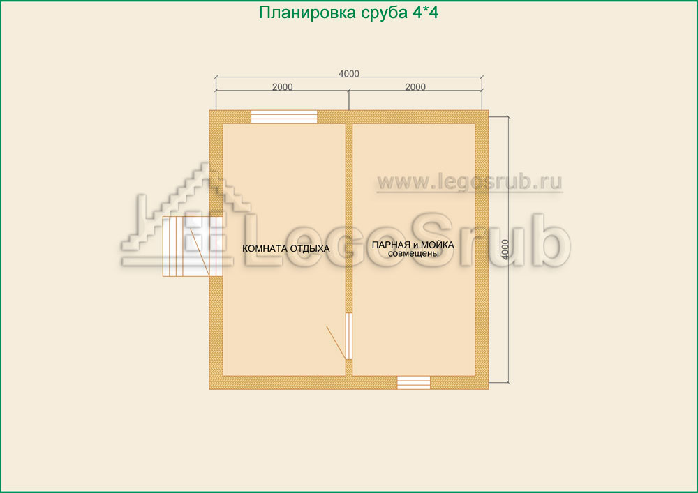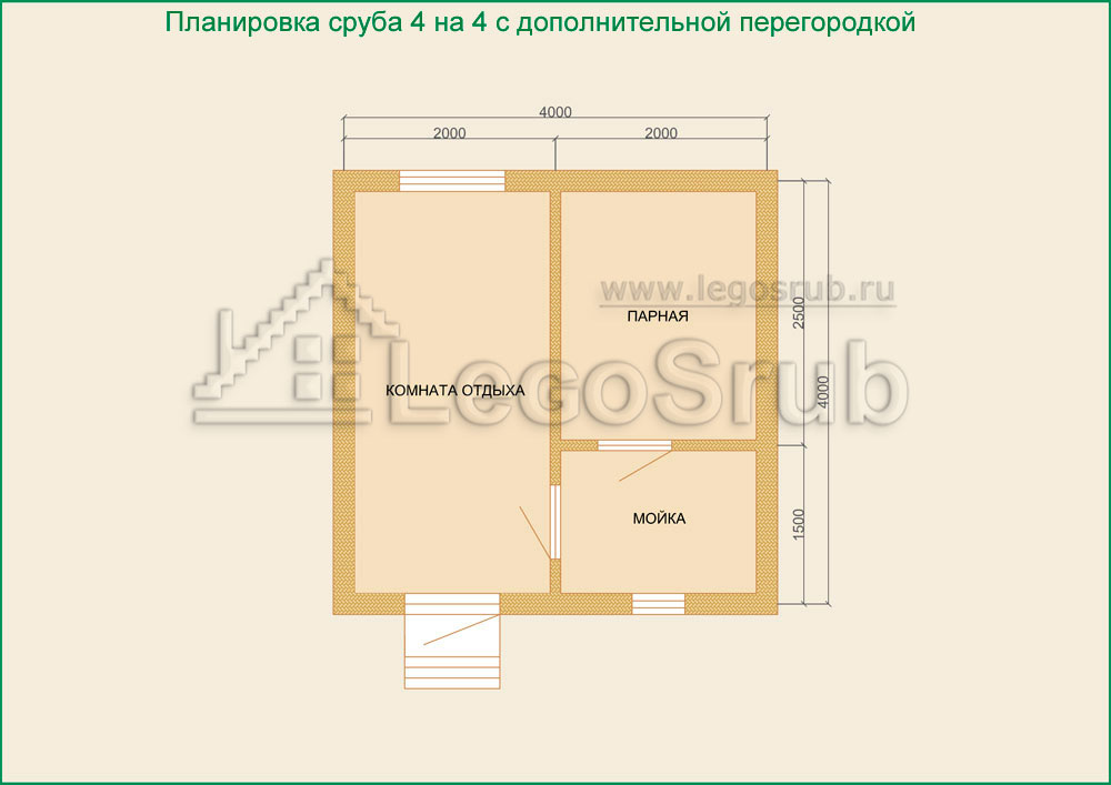 Вагонка на потолок толщина 20 (мм.) -500 (руб/м²) Дверь деревянная на иглицах с коробкой без фурнитуры и монтажа размер: 1750х750 -3800 (руб/шт.) Окно двойное без стекла, фурнитуры и монтажа размер: 500х500 -1500 (руб/шт.) (пиломатериалы и столярные изделия - естественной влажности.) Планировка:На стадии планировки сруба для бани обычно всех беспокоит множество вопросов. Делать ли парную и моечную отдельно, где и как расположить двери и окна, сколько комнат будет в срубе?..Не беспокойтесь!!! Наши специалисты всегда ответят на волнующие Вас вопросы, помогут принять оптимальное решение. Планировка будет происходить под Вашим руководством. Размещение внутренней перегородки, размер помещений, даже расположение будущих окон и дверей сможете выбрать Вы сами. А мы постараемся помочь Вам в этом нелегком выборе. Ниже представлены чертежи, наиболее популярных планировок для бань размера 4*4.