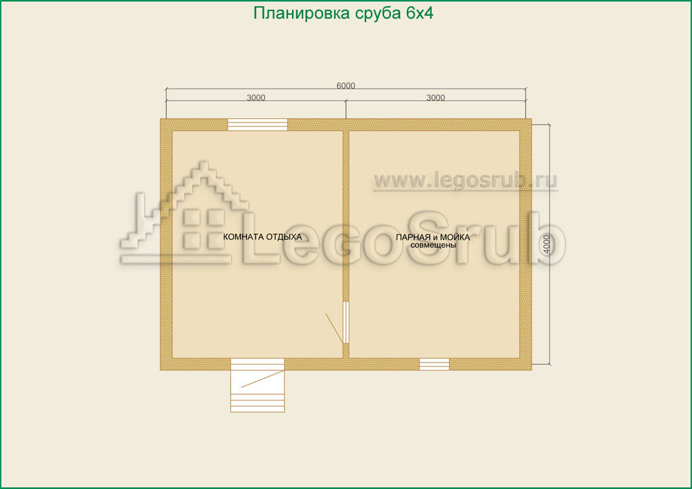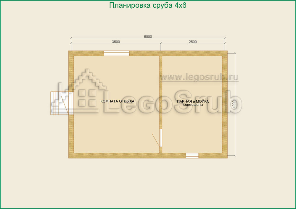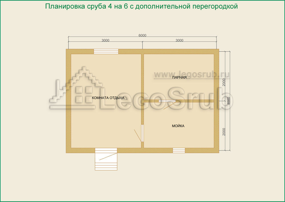 Вагонка на потолок толщина 20 (мм.) -500 (руб/м²) Дверь деревянная на иглицах с коробкой без фурнитуры и монтажа размер: 1750х750 -3800 (руб/шт.) Окно двойное без стекла, фурнитуры и монтажа размер: 500х500 -1500 (руб/шт.) (пиломатериалы и столярные изделия - естественной влажности.) Планировка:На стадии планировки сруба для бани обычно всех беспокоит множество вопросов. Делать ли парную и моечную отдельно, где и как расположить двери и окна, сколько комнат будет в срубе?..Не беспокойтесь!!! Наши специалисты всегда ответят на волнующие Вас вопросы, помогут принять оптимальное решение. Планировка будет происходить под Вашим руководством. Размещение внутренней перегородки, размер помещений, даже расположение будущих окон и дверей сможете выбрать Вы сами. А мы постараемся помочь Вам в этом нелегком выборе. Ниже представлены чертежи, наиболее популярных планировок для бань размера 4*6.