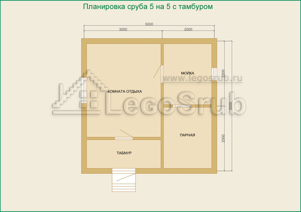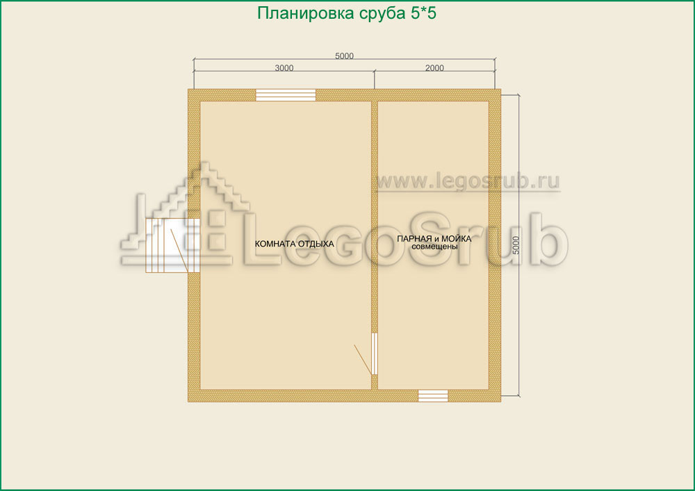 Вагонка на потолок толщина 20 (мм.) 500 (руб/м²) Дверь деревянная на иглицах с коробкой без фурнитуры и монтажа размер: 1750х750 -3800 (руб/шт.) Окно двойное без стекла, фурнитуры и монтажа размер: 500х500 -1500 (руб/шт.) (пиломатериалы и столярные изделия - естественной влажности.) Планировка:На стадии планировки сруба для бани обычно всех беспокоит множество вопросов. Делать ли парную и моечную отдельно, где и как расположить двери и окна, сколько комнат будет в срубе?..Не беспокойтесь!!! Наши специалисты всегда ответят на волнующие Вас вопросы, помогут принять оптимальное решение. Планировка будет происходить под Вашим руководством. Размещение внутренней перегородки, размер помещений, даже расположение будущих окон и дверей сможете выбрать Вы сами. А мы постараемся помочь Вам в этом нелегком выборе. Ниже представлены чертежи, наиболее популярных планировок для бань размера 5*5.