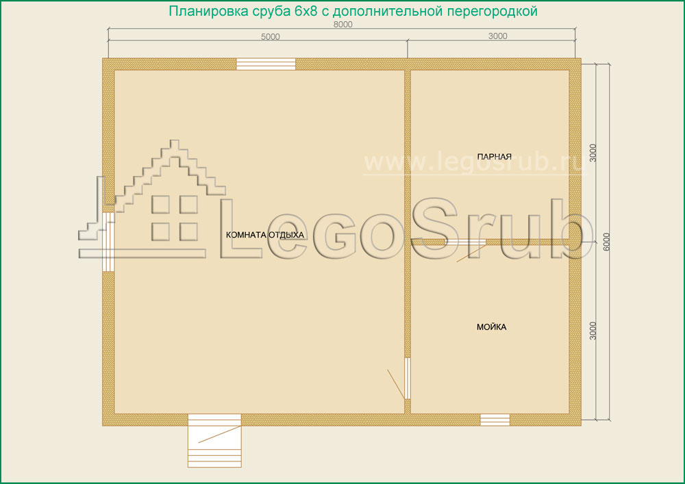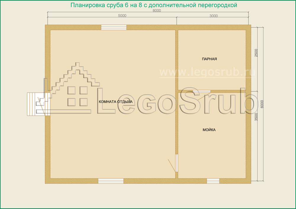Вагонка на потолок толщина 20 (мм.) -500 (руб/м²) Дверь деревянная на иглицах с коробкой без фурнитуры и монтажа размер: 1750х750 -3800 (руб/шт.) Окно двойное без стекла, фурнитуры и монтажа размер: 500х500 -1500 (руб/шт.) (пиломатериалы и столярные изделия - естественной влажности.) Планировка:На стадии планировки сруба для бани обычно всех беспокоит множество вопросов. Делать ли парную и моечную отдельно, где и как расположить двери и окна, сколько комнат будет в срубе?..Не беспокойтесь!!! Наши специалисты всегда ответят на волнующие Вас вопросы, помогут принять оптимальное решение. Планировка будет происходить под Вашим руководством. Размещение внутренней перегородки, размер помещений, даже расположение будущих окон и дверей сможете выбрать Вы сами. А мы постараемся помочь Вам в этом нелегком выборе. Ниже представлены чертежи, наиболее популярных планировок для бань размера 6*6.